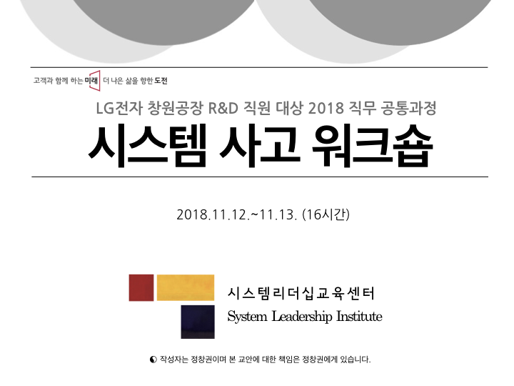 우리 학회 학회장이자 비영리단체 시스템사고교육센터 대표인 정창권 박사가 LG전자 창원 공장 R&D 센터 직원들에게 시스템 사고 교육을 총 16시간 진행했다고 합니다.
