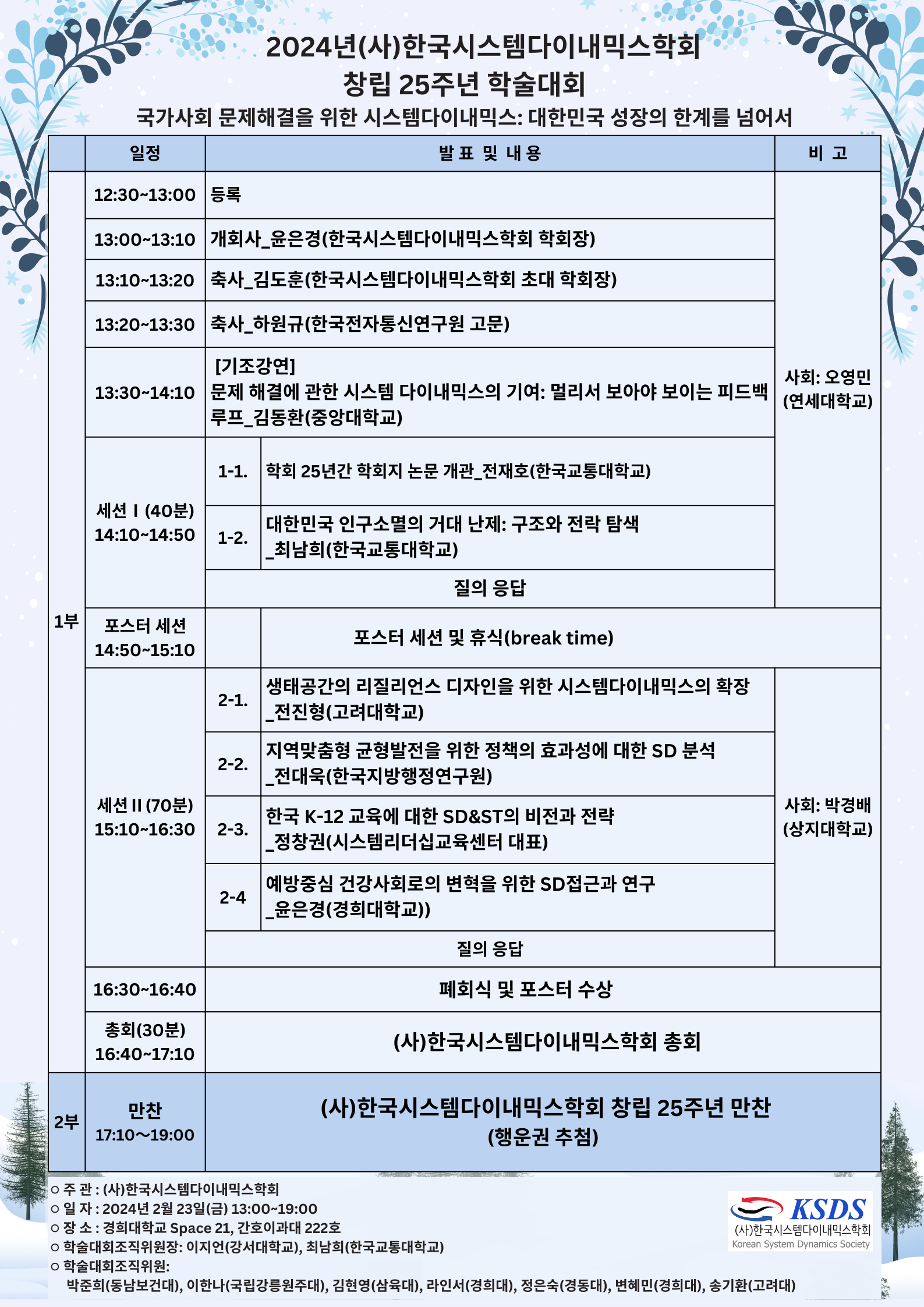 포스터 세션 14:50~15:10 | 시스템 사고를 활용한 3기 신도시 개발이 비수도권 지역에 미치는 영향 분석 _하민욱(국립한국교통대학교 행정정보융합학과), 최남희(국립한국교통대학교 행정정보융합학과) | 기후위기와 도시재난 측면에서의 도시 산불에 대한 사회-생태 시스템의 리질리언스 향상 전략 도출_강수정(고려대학교), 이정아(고려대학교) | 상습침수지역의 복합 침수요인 분석을 통한 도시침수 문제 해결방안 모색 _이원준(고려대학교), 이정아(고려대학교) | 재난 상황시 지역 공공보건의료 필수기능 활성화를 위한 방안 _정성모(경희대학교), 이창현(경희대학교), 강은규(경희대학교), 남하경(경희대학교) | 지역사랑 기부금의 기여효과와 활성화 전략에 대한 시스템사고 _이권민(국립한국교통대학교 행정정보융합학과), 최남희(국립한국교통대학교 행정정보융합학과) |