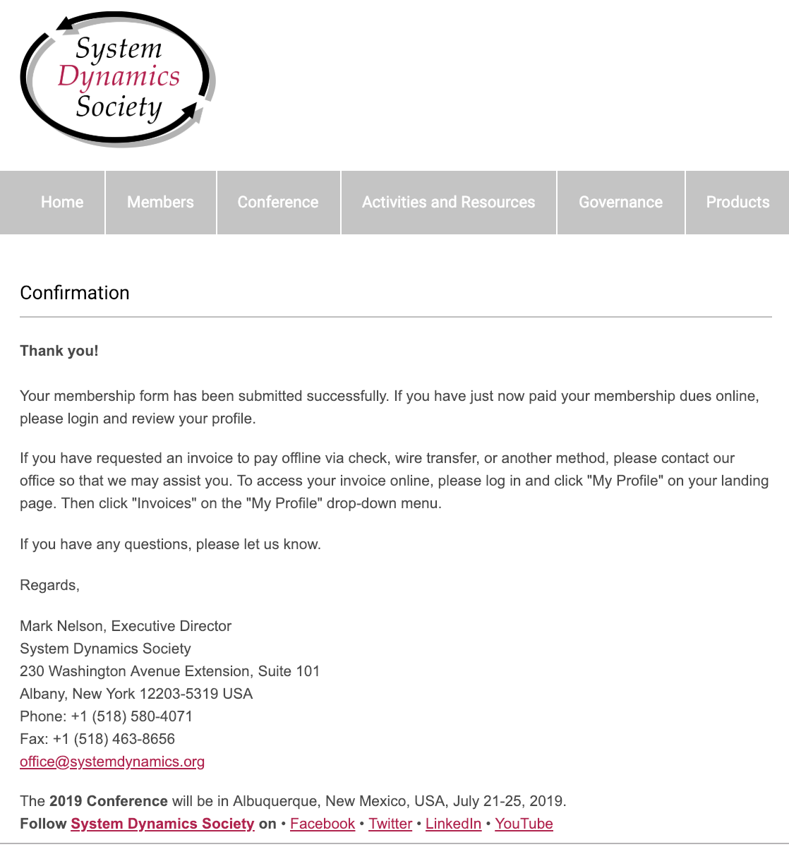 먼저 우리 학회의 연회원 또는 평생회원으로 가입해 주셔서 우리 학회를 굳건히 세울 수 있도록 힘을 실어 주십시오. 그리고 난 다음에 세계 학회에도 가입해 주십시오. 세계시스템다이내믹스학회와 한국시스템다이내믹스는 상호 피드백 관계가 있지만, 우리 한국 학회의 영향력을 키울 수 있는 방법 중 가장 중요한 것이 세계학회 가입하는 것입니다. 저부터 실천하겠습니다. 오늘 저는 다음과 같이 연회원 회원 자격을 갱신했습니다.