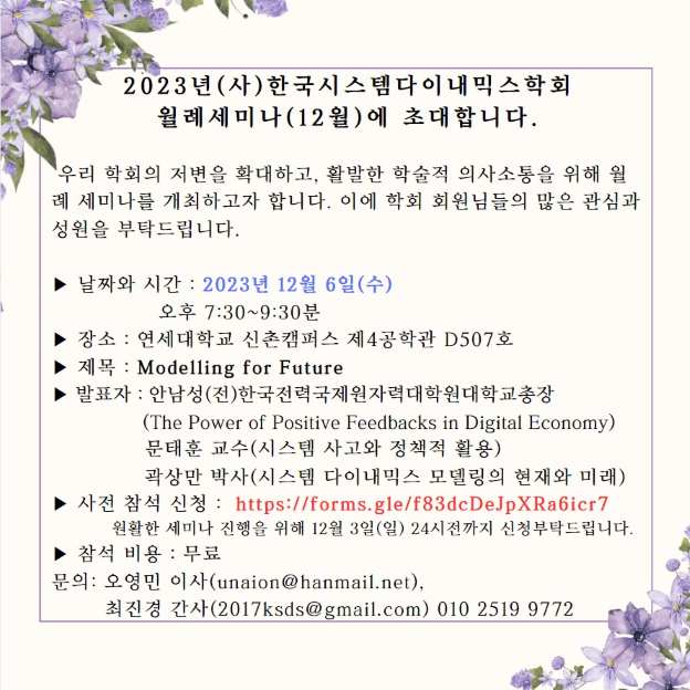 2023년(사)한국시스템다이내믹스학회 월례세미나(12월)에 초대합니다.