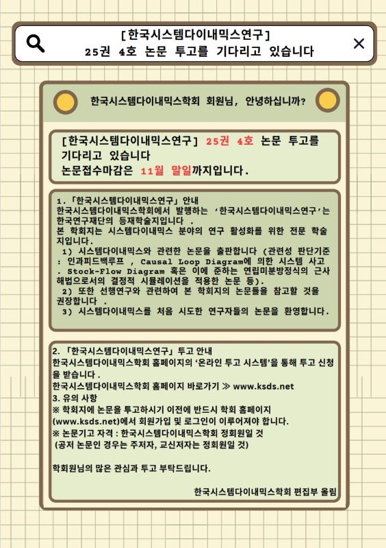 ※제출 과정 중에 시스템 상 문제가 생길 경우, 투고 마감일 21:00 전까지 간사에게 연락주시기 바랍니다. 문제 해결이 가능할 시간적 여유를 가지고 투고하시는 것을 권장합니다. ※24시가 넘어갈 경우12월 1일로 기록됩니다. 12월1일 날짜부터는 다음 호(26권1호, 2025년2월 28일 투고 마감, 2025년 3월 31일 발간)로 접수됩니다. |